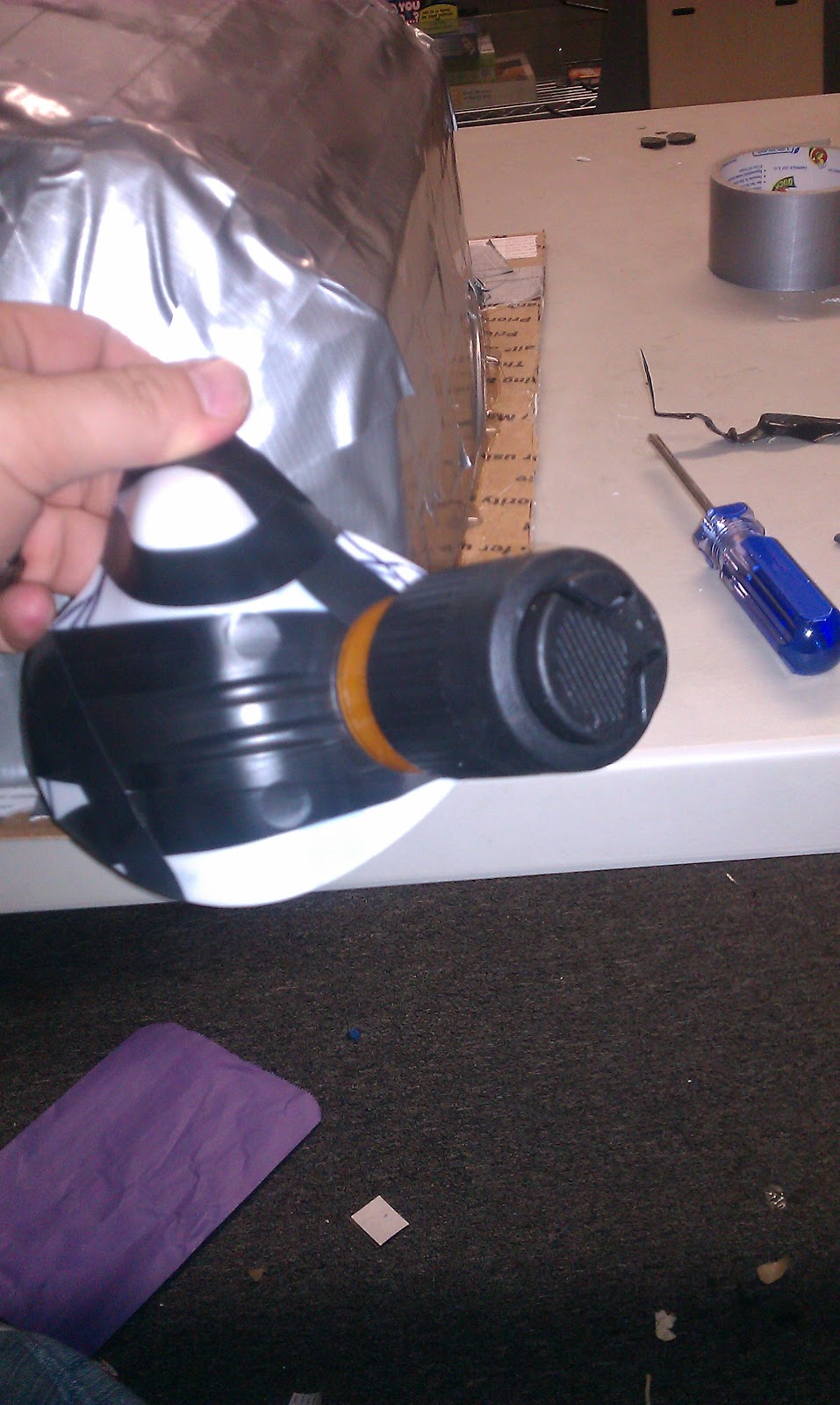 I then took the heat gun and removed the cap piece from the bottle, made an incision in the middle of the bottle and duct taped it up to keep from curling inward, and added an old broken pen to make the tip of the stinger...